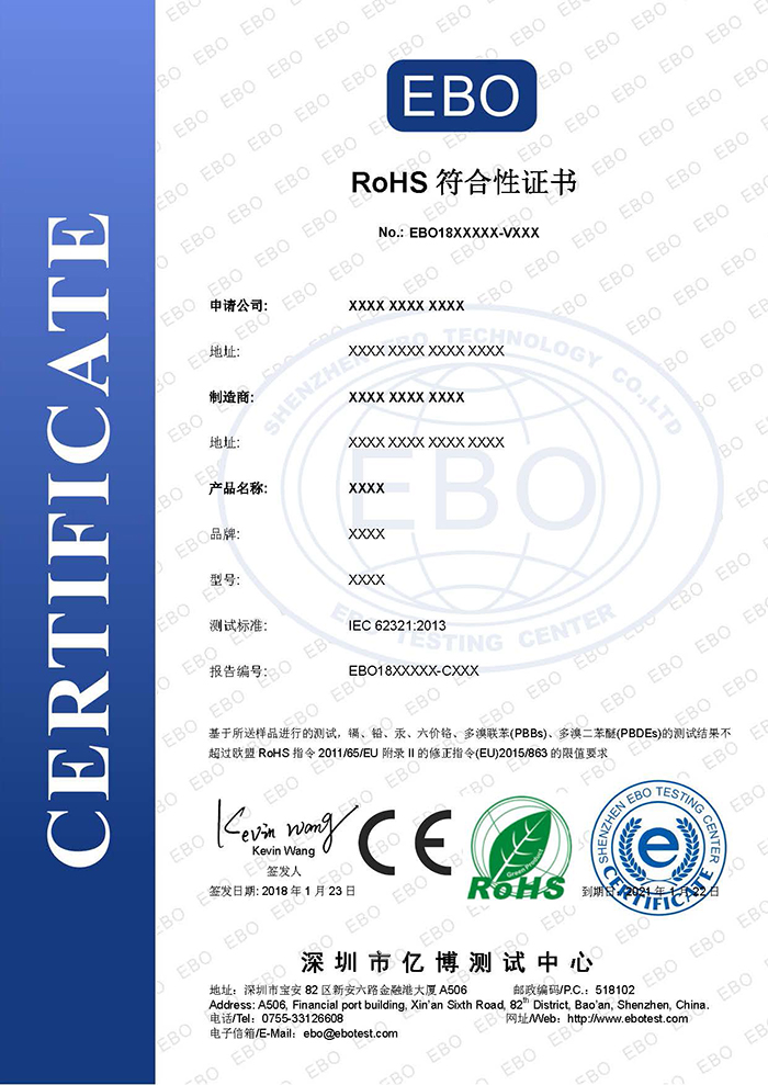 RoHS认证是由欧盟立法制定的一项强制性标准,它的全称是《关于限制在电子电器设备中使用某些有害成分的指令》(Restriction of Hazardous Substances)。该标准已于2006年7月1日开始正式实施,主要用于规范电子电气产品的材料及工艺标准,使之更加有利于人体健康及环境保护。