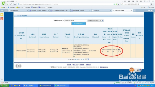 此时查询到的就是您的CCC证书号的所有信息,看证书的截止日期和有效性就在红色圆圈内(一般证书都是5年期限的,我查询的这个证书号就是已经过期的了)