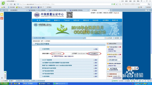 打开百度浏览器 输入“CCC证书查询”,然后“百度一下”,找到下方的“证书查询”的网页(记得一定要选择网页哦) 找到上述所说的“证书查询”网页,点击进去,进入“中国质量..