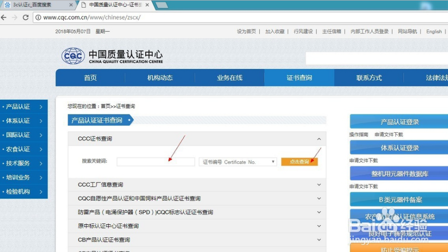 打开浏览器,百度CQC,进入CQC官g网就可以进行3c认证相关信息查询了。