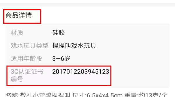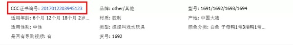 家长在电商平台购买玩具的时候,可以在商品详情页中留意是否有3C认证编号或者证书。(注:某宝只可在网页端查看,手机端的客户可以向客服咨询) 电商平台商品详情页上的3C认证编号: